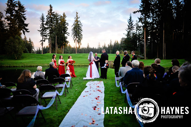 This wedding was unique because the weather man reported rain/so the outdoor wedding was moved inside. About 1 hr before the ceremony, Shylo realized that her prayers had indeed WORKed & so the wedding was moved back outdoors. The golf course in Lacey was the perfect backdrop for the fall wedding. As the sun set, Shylo & Matt made it official and became husband and wife–and it was such a pleasure to witness it! A sneak peek below: